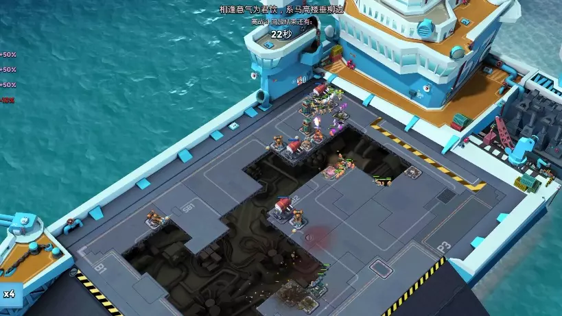 这是《海岛奇兵》的战斗母舰对局解说内容,展示了战斗母舰的对战过程,画面呈现了双方基地防御设施布局、战斗中的攻防操作,还有双方的属性强化数值,是一场有观赏性的对战回放。