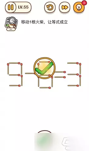 烧脑大师第55关答案解析 每次遇到烧脑大师里那种移动火柴棍的难题,我们都会觉得挺有意思的。这些关卡确实挺考验脑力的,特别是第55关,我们需要把【8】上面右边的一根火柴棍挪动,让等式成立。这个变化其实很简单,但每次看到新的题目,我们还是得仔细琢磨一下。 第55关的解题思路 1 把【8】上面右边的一根火柴棍移动,变成【6】。2 把前面的【3】,变成【9】。 就这么两步,等式就成立了。我们试着动手操作一下,看看是不是真的能行得通。