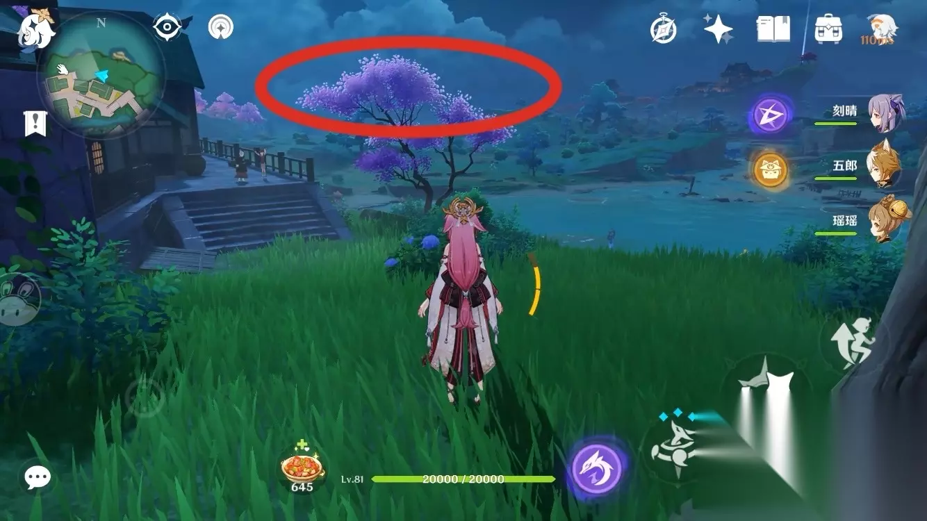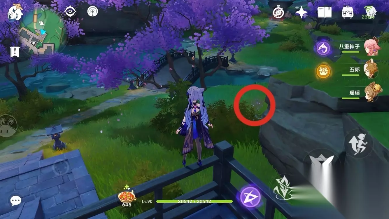 拿到之后继续往下,看到神龛后再往左边看,有一棵樱花树,下面就一个绣球