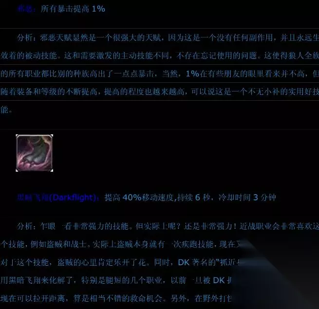 魔兽世界狼人种族天赋怎么样 种族天赋介绍: 恶意: 伤害提高1%。黑暗飞行:移动速度提高40%,持续10秒。
