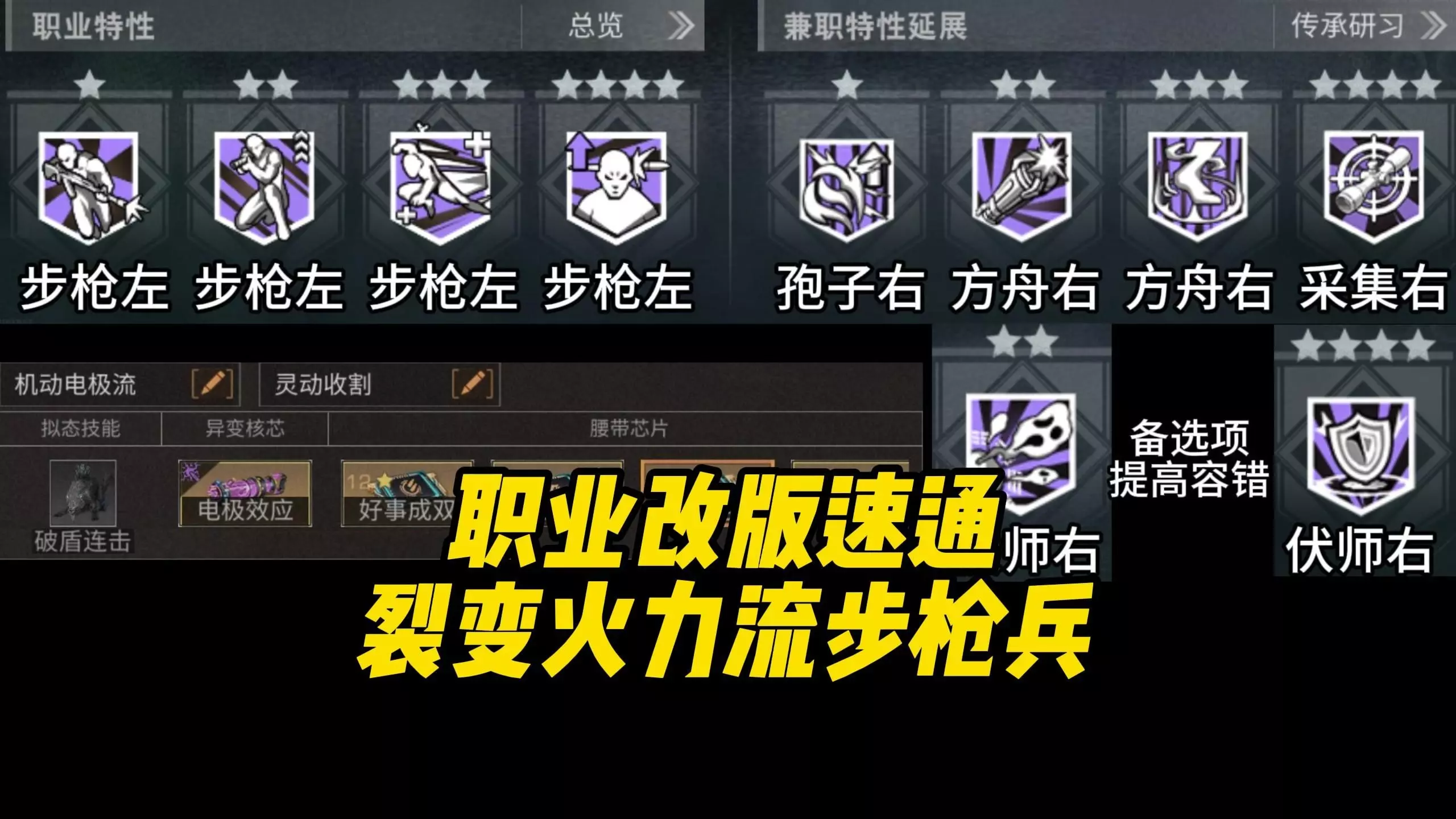 这是《明日之后》的步枪兵职业特性搭配攻略内容,介绍了两类步枪兵,还展示了电极决斗机动步枪兵的特性选择,如弹如雨下、夺命连击等,为玩家提供步枪兵的特性搭配参考。