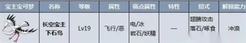 3、长空宝主-下石鸟 等级:Lv36-42 属性:飞行、恶 解锁坐骑招式:冲浪