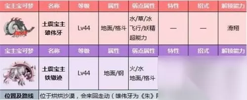 5、土震宝主-雄伟牙(朱)/铁辙迹(紫) 等级:Lv50-56 属性:雄伟牙(地面/格斗)、铁辙迹(地面/钢) 解锁坐骑招式:滑翔