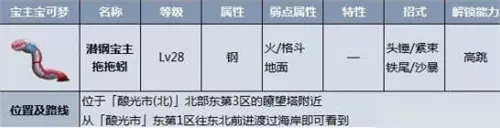 2、潜钢宝主-拖拖蚓 等级:Lv32-36 属性:钢 击败解锁坐骑招式:高跳