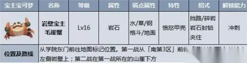 1、岩壁宝主-毛崖蟹 等级:Lv17-20 属性:岩石 击败解锁坐骑招式:冲刺