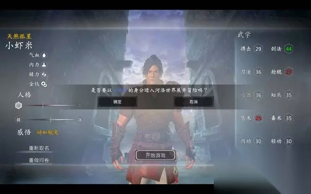 然后进入角色属性界面,注意,右边的技能是可以被重置的。 取名之后,正式进入剧情,由于默认主角名是小虾米, 所以,本攻略之后的主角名就叫小虾米了。