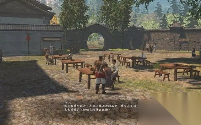 步骤5: 去小地图指示茶楼前面的市场,找头上名字为“江湖人”的人。 和他们对话可以打探到消息,可以知道,在不远处的山洞里面可以找到一个可疑的苗族妹子。