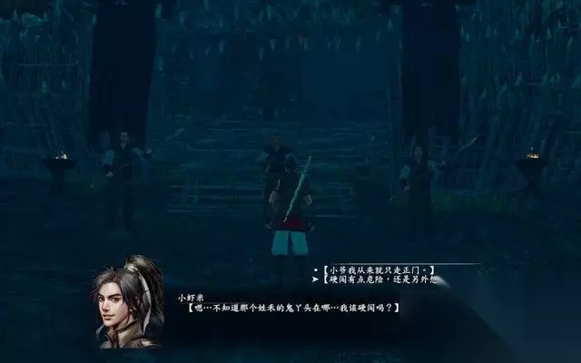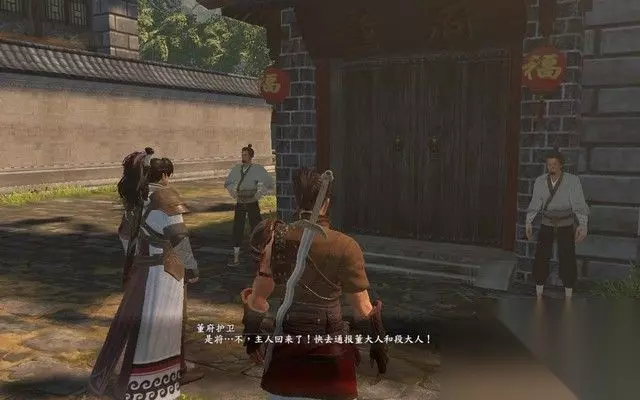 然后和最左边的卫兵对话,对话结束之后便可继续剧情了。 主角灵机一动,既然不可以从前门进入,那本少侠可以走后门呀!
