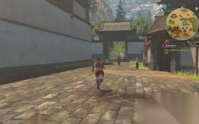 步骤2: 根据小地图指示找段思平的家,在酒馆右边,有个大宅子, 大宅子被白色围墙包围,你只要沿着白色围墙往右边走, 找到这个门口有两个卫兵的房子那就行了。