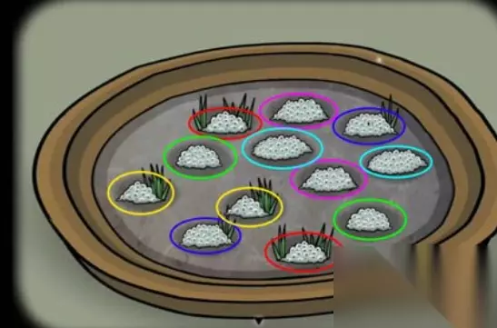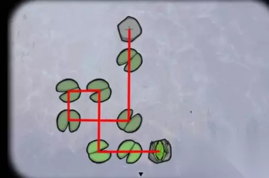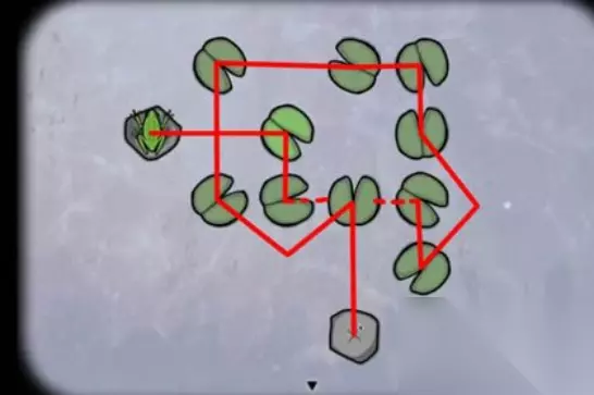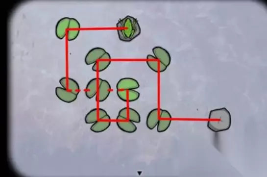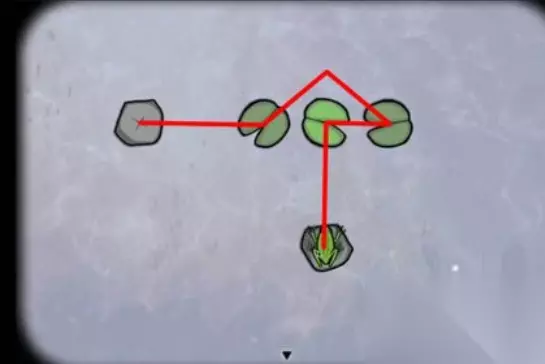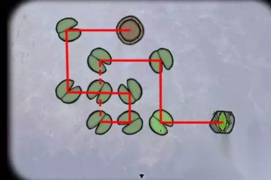 锈湖天堂岛蛙灾的攻略: 1、调查青蛙,然后控制青蛙跳过每一片荷叶落到石头上,5次以后得到第一只青蛙,过关图如下: