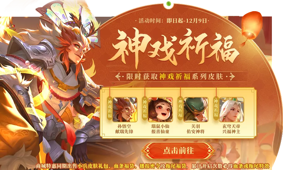 神戏祈福套系皮肤兑换活动开启!通过每日登录礼包获得兑换币到达一定数量即可兑换孙悟空-献瑞先锋、瑞鼠小仙-报喜仙童、关羽-佑安神将、玄穹天帝-兴福神主!