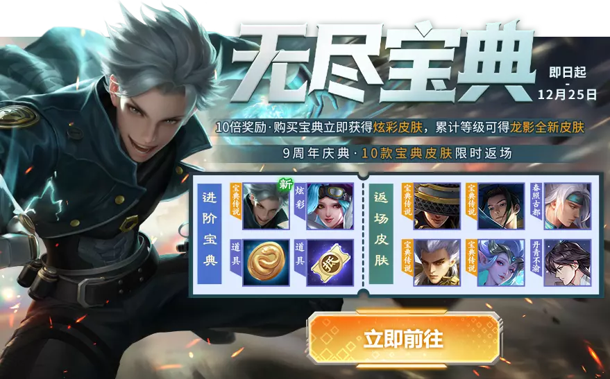 只需388点券即可获得10倍超值返利!现在购买最新的无尽宝典即可获得当期无尽宝典传说皮肤龙影-振武义警、炫彩皮肤黑桃皇后-哀艳女皇。