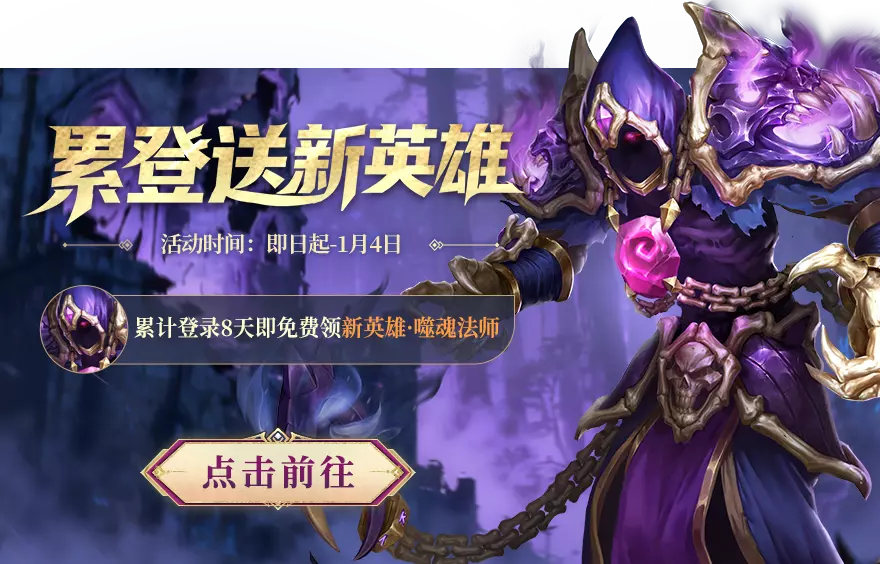 每日登录获得噬魂法师碎片,使用碎片兑换噬魂法师英雄礼包~