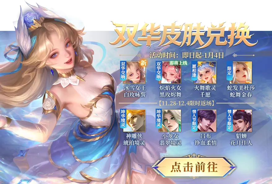 全新皮肤兑换开启!通过每日登录礼包等方式获得全新皮肤兑换币限时获取冰雪女王-白玫永誓、炽焰火女-黑玫烬舞、火舞歌灵-千愿、蛇发美杜莎-蛇舞金春等皮肤。