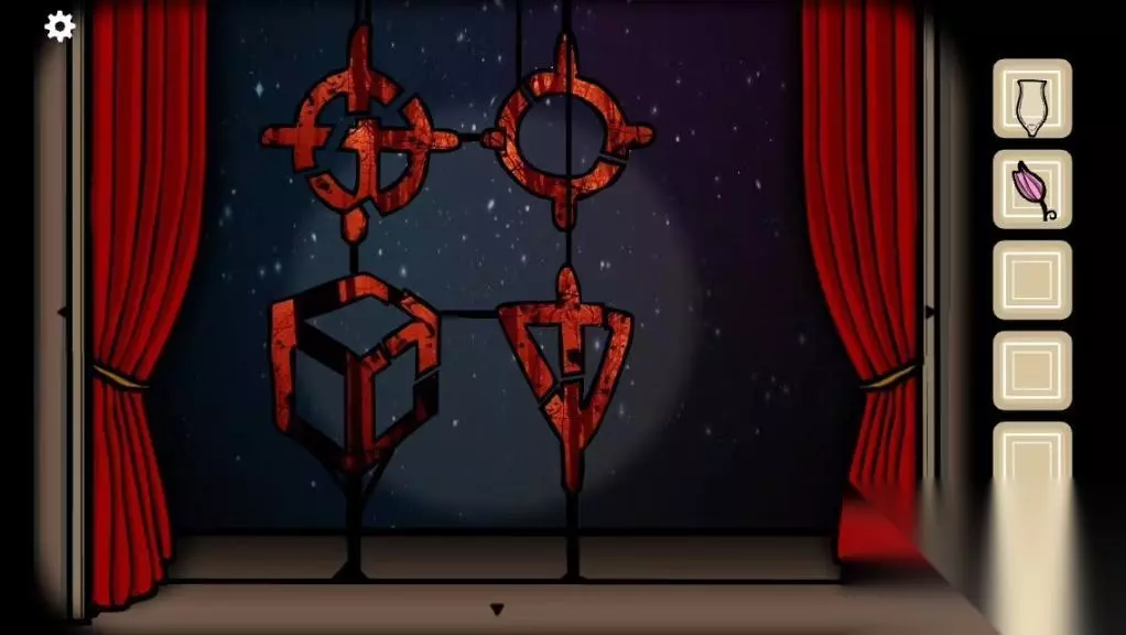 15.来到剧院,我们把得到的三件物品和帽子到盘子中,摆放的顺序从左到右海螺、婴儿、心脏、帽子。然后黑衣人嘴里冒光一直点击的到一朵未开的花。 16.第二场剧开始我们按照如图将场上的东西摆好,并记下图案。