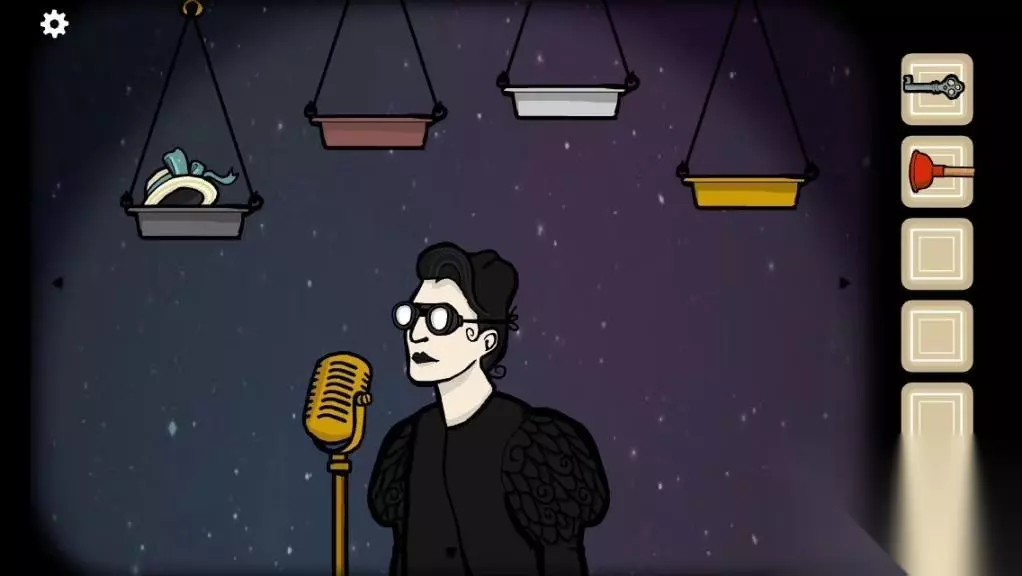 9.到带有厕所的房间,用螺丝刀和插头把灯修好。 10.灯修好后来到荧幕处,把帷幕拉开。一直点击带猫头鹰面具的主持人,然后节目开始。 11.第一位女士我们一直点击她的头然后头掉了。场上出现一位黑衣男人头上有四个托盘我们要收集三个道具。