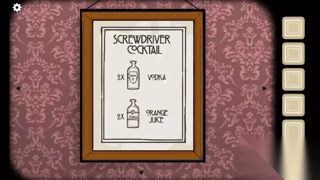 2.表上的两种酒都点两次,调酒杯晃完后再点击一下倒进高脚杯中,给男人喝下给我们一把螺丝刀。 3.这个男人衣服口袋中有一张明信片,不用在意继续游戏。 4.到有厕所的房间中,墙上有三个提示我们先看第一个提示显示的是钢琴,我们一定要记住这个提示。