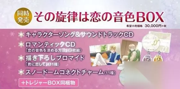最后,本作还将新增完美结局之后一年各个男主角的后日谈剧情“完美尾声ff”。在一年后的圣诞节、情人节等时间段都会发生一些特殊的事件,会在游戏发售后进行配信。如果在10月2日之前预定了珍宝盒或者“那旋律是恋的音色BOX”的话,将能够免费获得11人中月森、土浦、志水、火原、柚木、加地这6个人的“完美尾声ff”。 普通版: 实体/下载版:6800日元(约409元人民币) 珍宝盒: 售价:12800日元(约770元人民币) 附带内容: 1、游戏本体; 2、星奏学院相册ff,收录设定原画与本作中出现的事件插画,各个角色还会有手写的留言; 3、特制肖像画~音乐结下的羁绊~(2种),与本作的封绘成对的限定插画; 4、音符手机套,根据本作主题所特别设计的原创手机套。