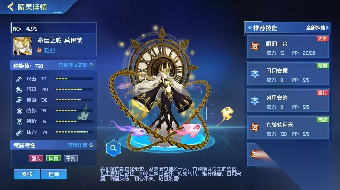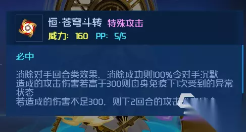 【恒·苍穹斗转】则清除对手回合类效果,并通过强制沉默或致命一击施加巨大压力,是对免疫型精灵的有力应对。 【列星安陈】提供全属性强化,尤其体力高于一半时强化效果翻倍,还能无视对手的能力强化,确保先手优势。 【九转轮回天】反转能力下降状态并必定打出致命一击,同时对能力下降的对手触发异常状态,极大提升输出。