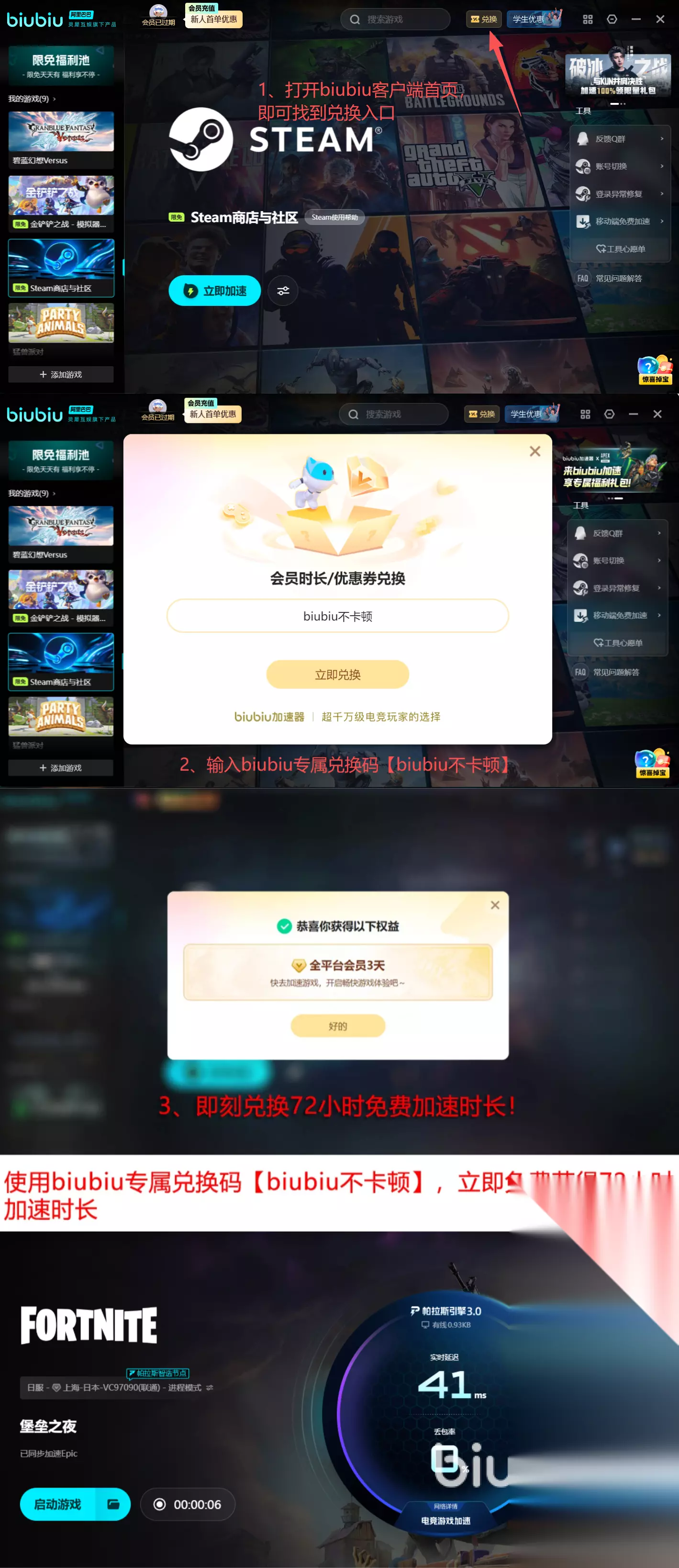 此刻,正是体验biubiu加速器的最佳时机!平台推出限时新人激励,注册即享24小时全平台无门槛加速。还有额外加码,输入专属口令【biubiu不卡顿】,免费加速时长再延长72小时!总计高达96小时的优质加速时长,足以支撑玩家在多轮紧张激烈的堡垒攻防战中畅行无阻,不再被闪退这一困境影响。