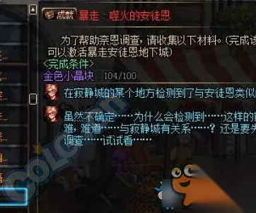 入场条件: 85级 需要做<暴走:噬火的安图恩> 暴走安图恩任务要求: 100个金色小晶块