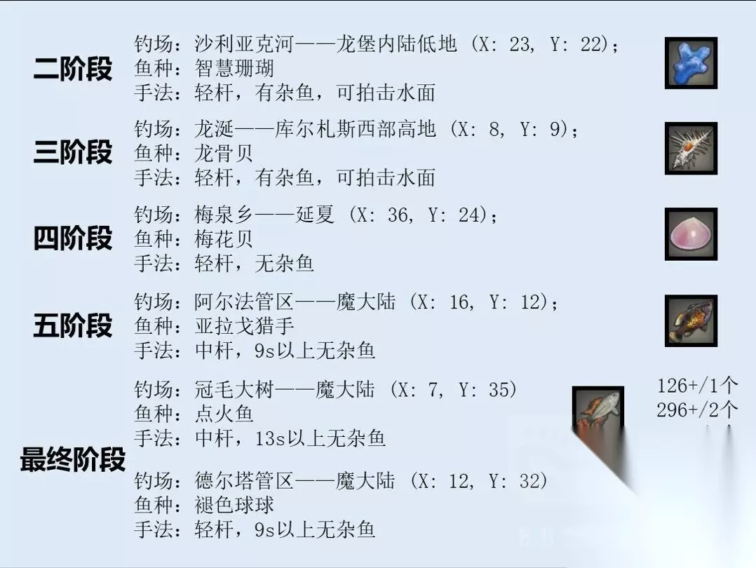 3.2 天钢工具第二阶段: 收集40个[智慧珊瑚HQ]在天钢机工房内NPC德尼斯处和背包内<天钢钓竿>交换<天钢钓竿+1>。 钓场:沙利亚克河——龙堡内陆低地 (X: 23, Y: 22); 鱼种:智慧珊瑚(轻杆)秋叶鱼(轻杆)船虫(中杆);