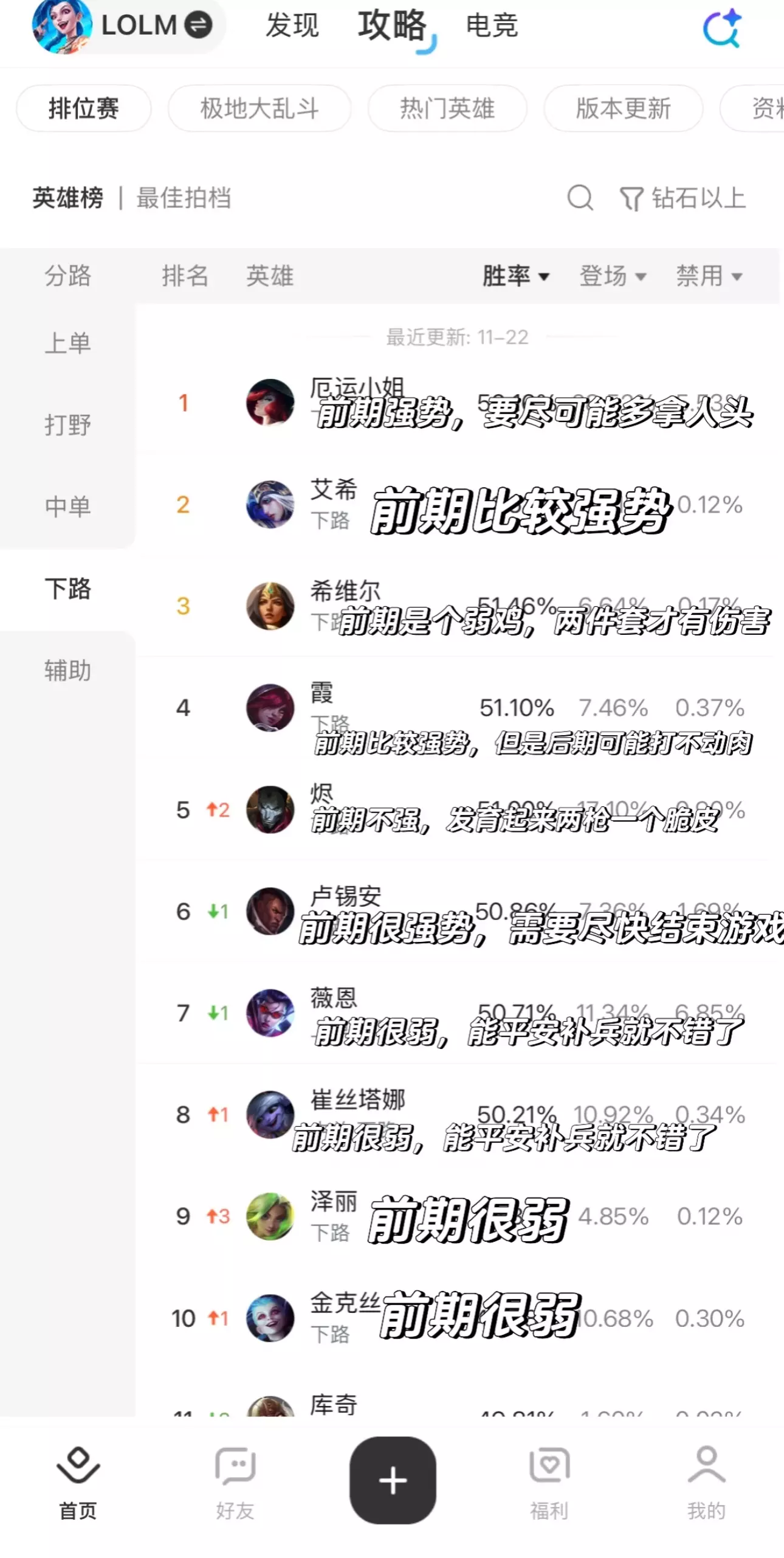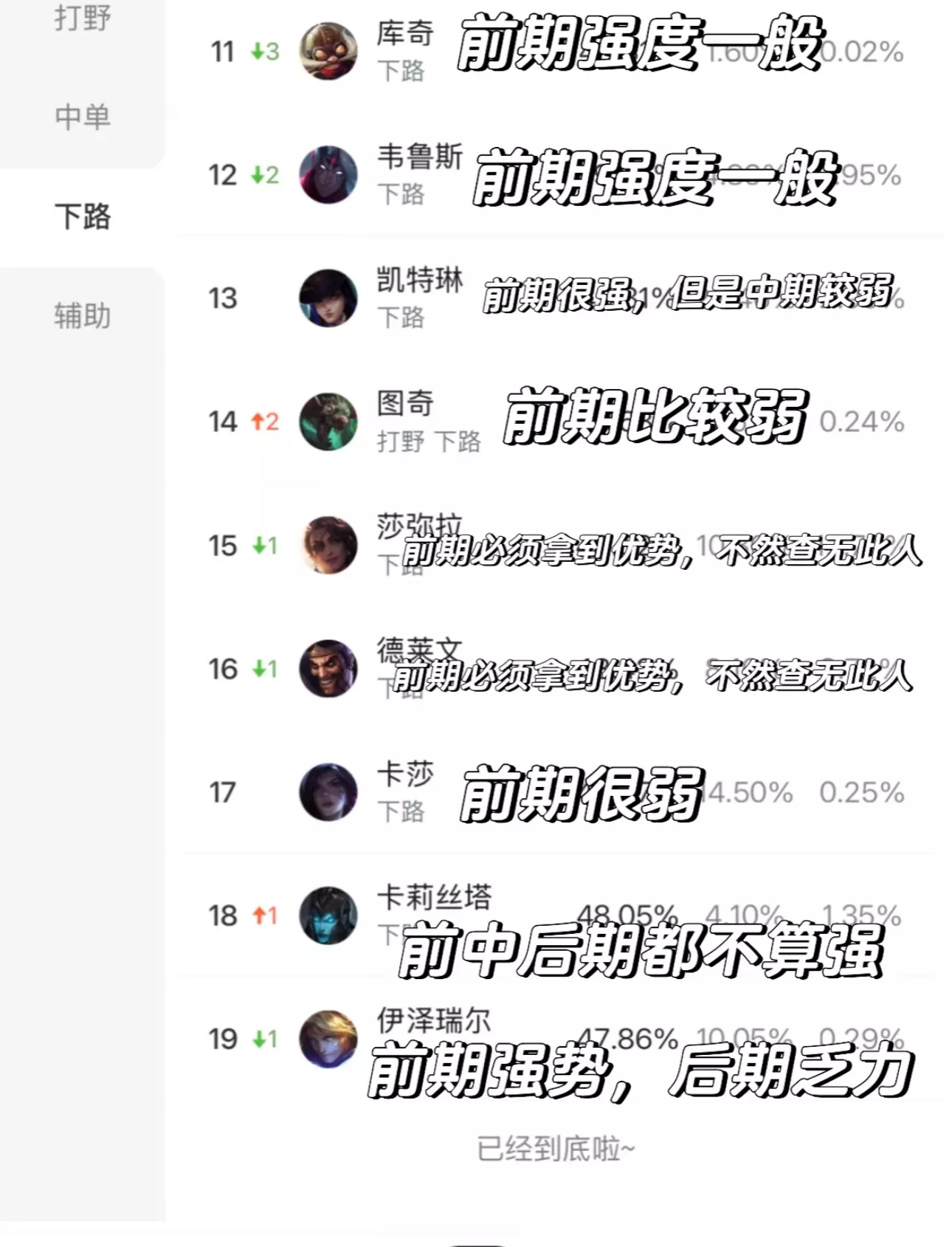 今天在xhs遇到一个辅助妹妹发贴抱怨,说前期她开了队友不上,所以她认为必输了。 我一看她家阵容(图3),简直是让人眼前一黑的程度:上单腕豪、打野老鼠、中单维克托、射手金克丝,而她是一个出了辉耀美德和蓝甲两件肉装的酸辣粉。 我点评(图4),你家前期没人有伤害,除非有机会多打少,不然开团了也打不过。 可她跟我说,和酸辣粉配合默契好拿头,前期不要太保守,能多拿头就多拿头,后期一般打不过。 但是,你家就是后期阵容啊[笑哭R]后期阵容却妄想前期拿尽可能多的人头,那只能指望对面足够菜了,但是如果对面不够菜怎么办呢?[抠鼻R] 通过和她的聊天,我发现,很多人对于阵容发力时间点根本没概念[害羞R] 不过这东西本来也不属于常识,我决定对打野、中单、射手,三条路的常见英雄都做个相关的简介。 但是打野和中单的常见英雄太多了,只有射手最少,就从射手开始做吧。 [樱花R][樱花R][樱花R][樱花R][樱花R][樱花R][樱花R][樱花R][樱花R][樱花R][樱花R][樱花R][樱花R][樱花R][樱花R][樱花R] 图1和图2里,标注前期强势的射手,前期需要尽可能多拿人头。最极端的就是卢锡安、德莱文、莎弥拉,前期没有优势,后期查无此人,因为手短。然后拿到优势也要尽快结束游戏。 标注前期弱势的射手,一般前期需要尽可能保护好自己的同时多补兵,想办法吃经济,争取拖到后期发力的机会。 射手的发力时间,不仅射手和辅助需要知道,打野也需要知道,不然强抓就是害人,比如我前几天挂的那个打野。 以及,双人路情况比较复杂,辅助的强弱也需要考虑。 [海豚R][海豚R][海豚R][海豚R][海豚R][海豚R][海豚R][海豚R][海豚R][海豚R][海豚R][海豚R][海豚R][海豚R][海豚R] 那么,按照那个辅助妹妹的的想法,如果遇到前期弱的射手,她想帮助射手完成击杀,需要怎么办呢? 那需要辅助把伤害拉到最高,弥补射手前期伤害的不足,同时自身也会特别脆,所以需要高超的技术和操作和战场意识。 如果是酸辣粉辅助,那具体办法就是:符文带电刑和三红,装备出窃魂法典、杀人书(要叠到20层以上)、卢灯、法爆、破盾、大帽等。 这样做的缺点也很明显,射手和辅助都容易被秒,可能出现两个脆皮你救不了我、我也救不了你的情况。只能先把对面秒了才能打赢。#英雄联盟手游 #lolm #辅助 #射手 #打野