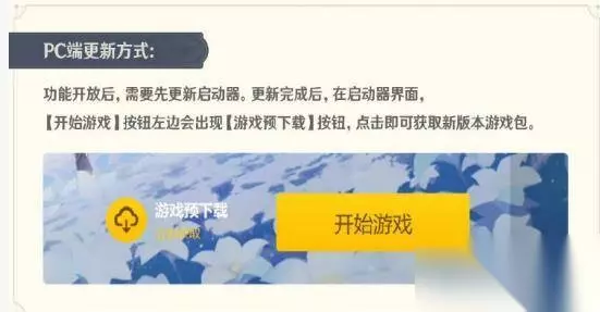 PC 端: 功能开放后,需要先更新启动器。 更新完成后,在启动器界面,【开始游戏】按钮左边会出现【游戏预下载】按钮,点击即可获取新版本游戏包。 凡进行过预下载,都可加快启动器在版本更新时的更新进度。