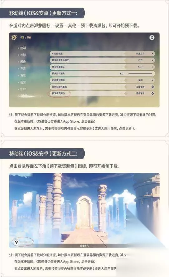 移动端(iOS & 安卓): 方式一,在游戏内点击派蒙图标-设置-其他-预下载资源包,即可开始预下载。 方式二,点击登录界面左下角【预下载资源包】图标,即可开始预下载。 在版本更新时,iOS 设备需要进入 App Store,点击更新。 安卓设备进入游戏后,按照游戏内弹窗提示完成更新。 凡进行过预下载,都可加快在登录界面的资源下载进度。