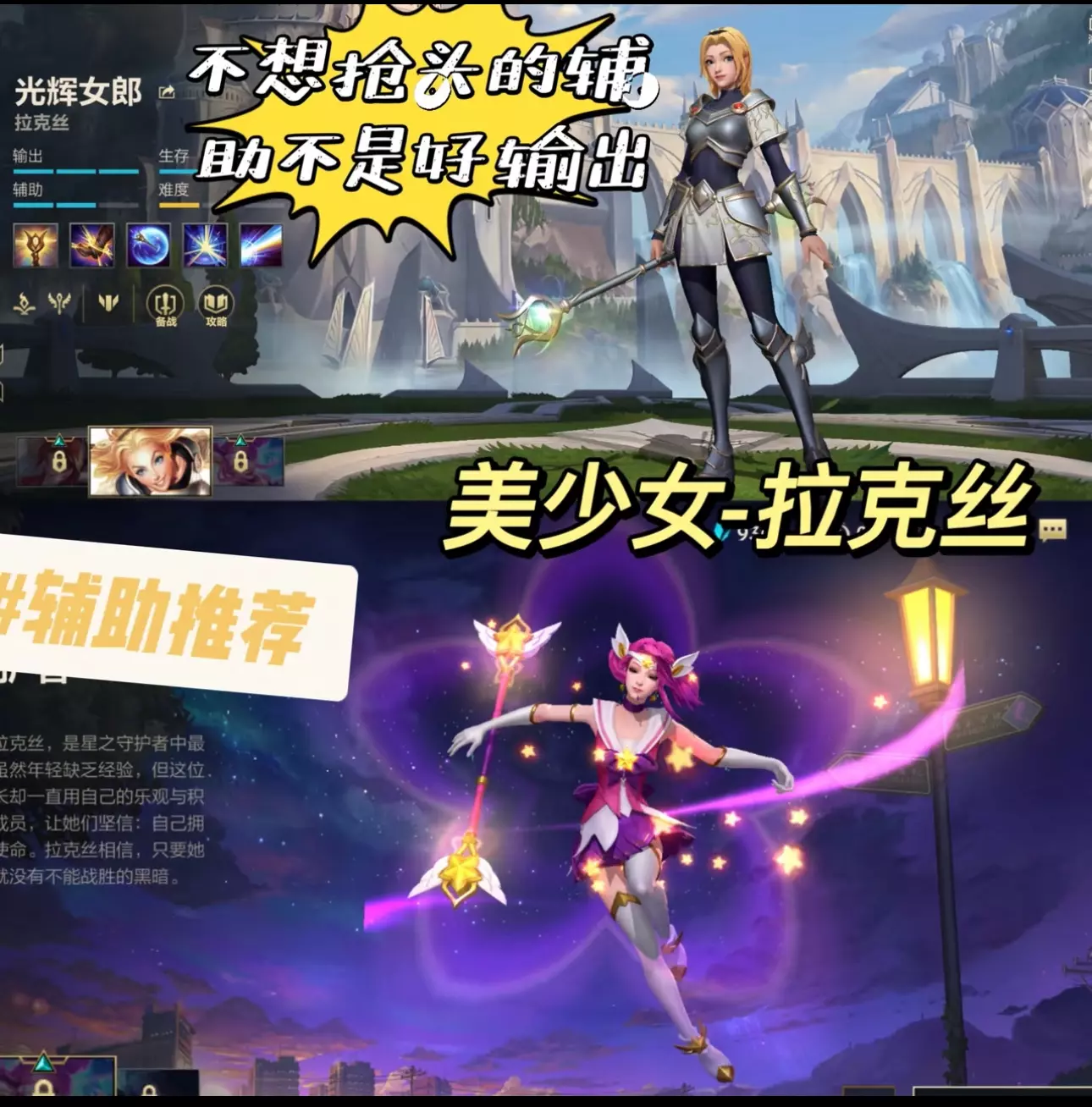 光辉!!YYDS 简单易上手👍🏻 集美们快学她 抢头辅助 不想抢头的辅助不是好辅助[色色R] 💫技能介绍: 被动 伤害命中敌人5s能量效果 再次普攻将点燃能量造成额外🔮伤害! ❗一三四技能都是伤害技能 命中后都可以增加普攻效果 1️⃣技能:就是个控 很好理解 专业叫束缚 可以想为妲己的控制!还可以控制直线的两个目标 很绝 👏🏻👏🏻. 配合一闪可以增加禁锢距离 2️⃣辅助定位核心技能 提高护盾值 释放沿途可以获得两次护盾 来回各一次 像个回力标 自行脑补 最多可以给五个队友加护盾呢!刚开始玩她的我 没看技能介绍 全释放到敌人身上了[失望R] 3️⃣释放一个光💡圈 范围内降低移速 5s后引爆 再点一下三技能 可以提前💥 用来跑路 让敌人追不上我们管用 4️⃣发射直线全屏光束❗ 全屏诶!什么概念 姐妹们 那不就是鲁班的抢头炮 女娲的致命直线中伤 这么一个概念么!瞄准残血的 jiu的来一下 头不就来了!?😝😝 拉克丝简单易上手 技能很好理解!上分英雄!!最近新宠 安利给各位姐妹们 而且还是个光辉仙女[色色R] [萌萌哒R]不过要注意预判 但不注意可能也会是最好的预判 #LOL #英雄联盟手游 #新手英雄 #lol拉克丝