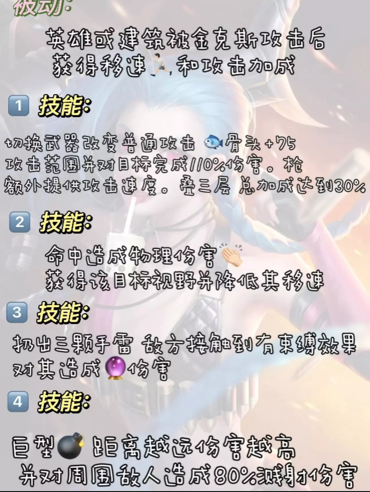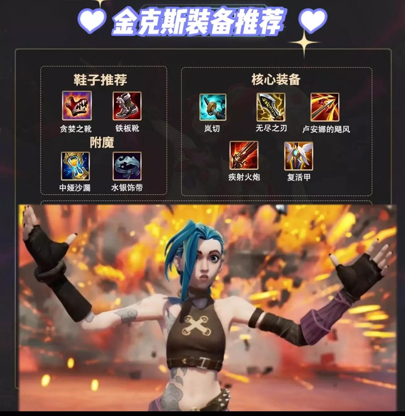 最近英雄联盟.双城之战大🔥 相信很多👭们都看了! 可以说金克斯真的太帅 太美腻了❗ 有没有人能给我透漏下④集后的剧情 没钱冲会员[喝奶茶R] 所以只能在峡谷钻研我们的大小姐了! 话不多说 技能 出装 铭文都放在🤮图上了 🔸🔸文字解说对线技巧🔸🔸 👏🏻金克斯开启炮形态的Q技能后,射程和伤害能力都有很大的提升,所以,对线期间,金克斯不逊色于任何一个AD,配合有控制技能的辅助英雄,金克斯有着很强的对线单杀的能力👍🏻 重点📑: 当辅助控制到以后,金克斯可以在其身后放上E技能,增加控制的连接性,并且使用W技能将其减速。(辅助控制 E+W)同时,W技能也是一个很好用的消耗技能,能够有效的消耗到远处的英雄,还能够作为探视野来使用。R技能通常作为收割时候的技能来使用,是一个很好用的收割斩杀技能。 👏🏻金克斯在团战中不要刻意的追求去击杀🚶♂️,就算是助攻,也能够有效的提高金克斯的移动速度,不要害怕追不上别人,金克斯的移动速度会提升一倍之多,所以,只要参与了推塔或者击杀,就没有金克斯追不上的人(姐妹们 都给我暴走🏃🏻❗)。 团战中的金克斯,要多使用炮形态的Q技能,尽量多的打出AOE的伤害效果,为团队做出足够的伤害输出,然后使用R技能,做最后的团战的收尾。 但是金克斯没有位移技能,所以,前期的团战一定要找好自己的输出位置,不要被瞬间秒杀,从而失去输出的能力。猥琐在后面 有机会就冲!!![生气R][生气R][生气R] #英雄联盟手游 #我我就是金克斯 #金克斯 #遇见金克斯 #英雄联盟攻略 #英雄联盟手游攻略!#我就是金克丝 #金克斯蓝