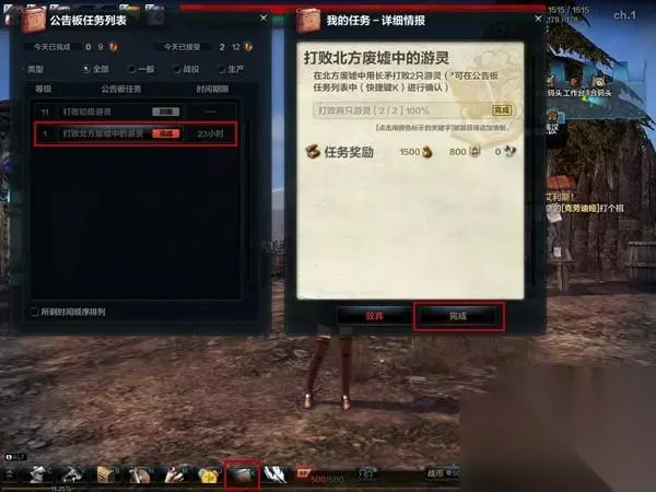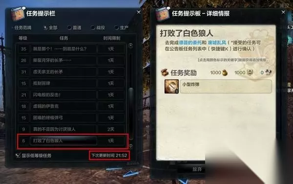 2、在接取每日任务后,玩家立即按"K"键能够查看每日任务的具体情况。 假如任务在指定时间限制内进行,直接点击详尽情报里的"完成"键,玩家即可获得相应奖励。 假如在指定时间限制内未完成的话,该任务自动废止,玩家能够直接放弃。