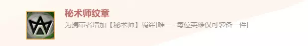 秘术师纹章装备效果 为携带者增加[秘术师]羁绊[唯一- 每位英雄仅可装备一件] 秘术师纹章纹章装备解析 所有友军获得魔法抗性 所有友军获得魔法抗性。 (2)40魔法抗性 (3)80魔法抗性 (4)150魔法抗性 (5)250魔法抗性