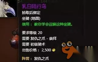 魔兽世界7.1乳白陆行鸟获取攻略,7.1至高岭将会添加一个新的阵营利爪复仇,这个阵营声望当你达到崇拜后,就可以解锁乳白陆行鸟坐骑,和小编一起来看看魔兽世界7.1乳白陆行鸟获取攻略吧! 玩家可以花费10,000G购买一个乳白陆行鸟坐骑,这个坐骑几乎就是白色陆行鸟的低配版,乳白陆行鸟比起白色陆行鸟就是就少了一些配饰。 乳白陆行鸟: