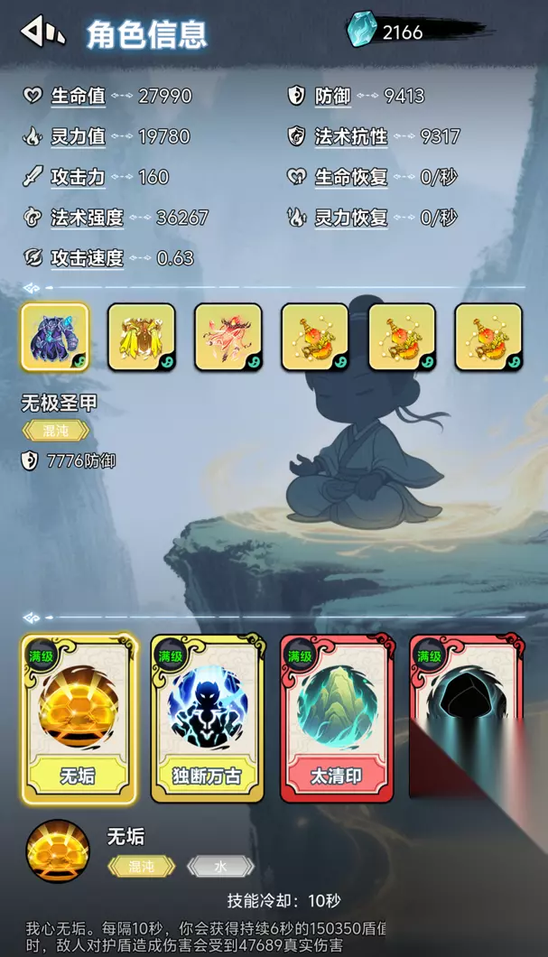 因此这时就要拿出我们绝对的真伤了——无垢 十秒冷却,自动续6秒盾,虽说有真空期,(开始我还以为是有能破盾的小怪呢)但在前90关都完全不用操心,横着走,怪都坚持不到你盾没,盾比血条厚好几倍, 这里拿出我的技能组合, 无垢,独断万古,太清印,逆天改命 独断万古,主打一个减伤保盾 太清印,主要用来防控,(后面怪太恶心,这都解控不过来 ,) 逆天改命,给其他技能减cd,不管是连来两个万古还是续个盾保真空期都十分给力(能给无垢刷cd) 装备这里推荐, 1.无极圣甲,2.天魔羽衣(没这俩防御真刷不高), 然后来个3.鸿运蟠,稍微加一些续航,(该流派蓝耗不大,其实刷完上限应该卖了的,忘了) 4.然后就是主c加法强的葫芦拉满, 5.或者带个混沌珠保真空, 然后就是属性加点, 机缘礼包, 1.见法强拿法强,毕竟这个关乎我们盾厚度和反击强度, 2.防御,法术抵抗,连带雨衣和圣甲,数值到减伤百分之99就差不多能停了,接着点生命,在往上貌似没啥用, 3.生命 4.灵力上限,这个适当点点就行了,消耗不大,有鸿运蟠够了 5.攻击力,攻击速度,没啥用不点,也不用普攻打