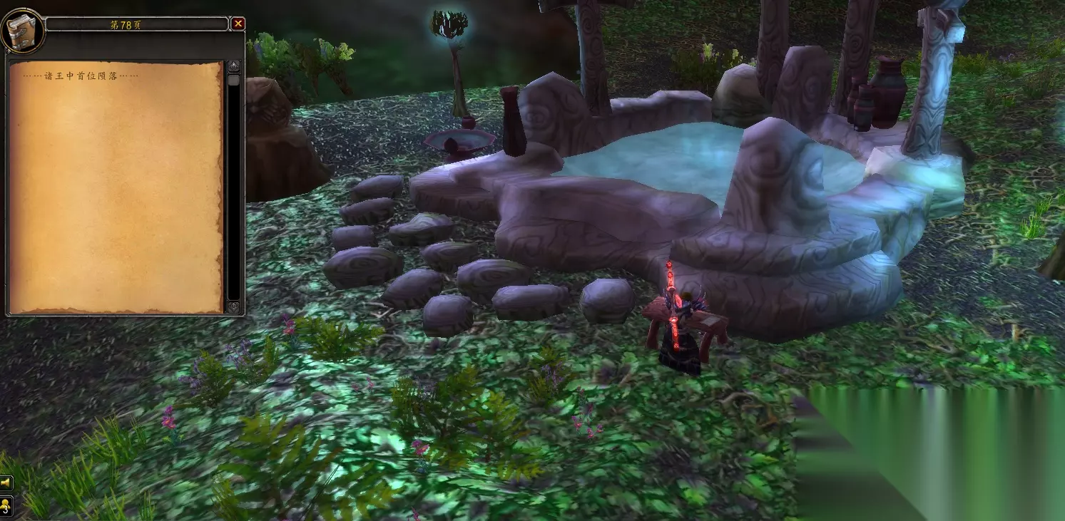 然后来到东部王国的暮色森林,坐标(49,34)处月亮井旁的凳子上有第78页,“……诸王中首位陨落……”暗示第一位被击杀的元素领主拉格纳罗斯。(如下图)