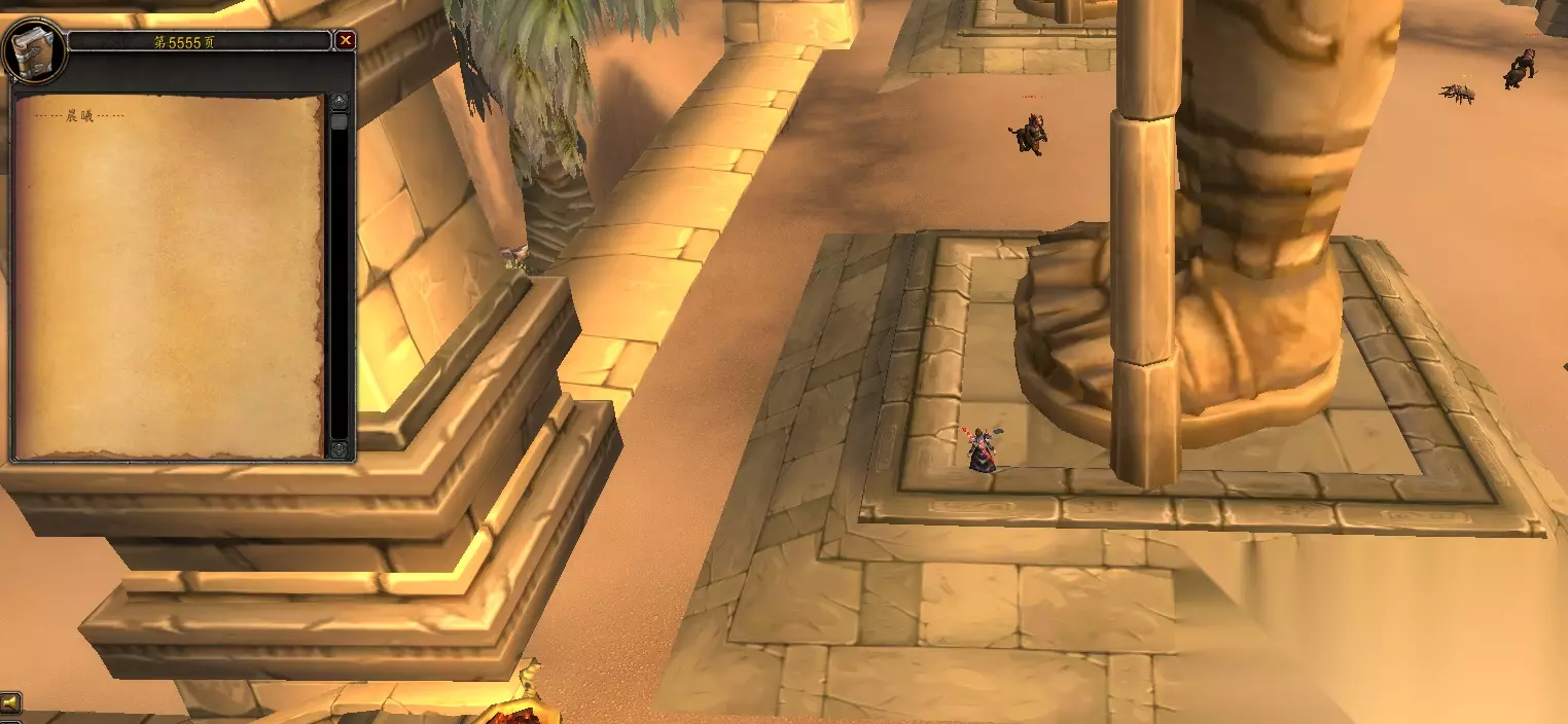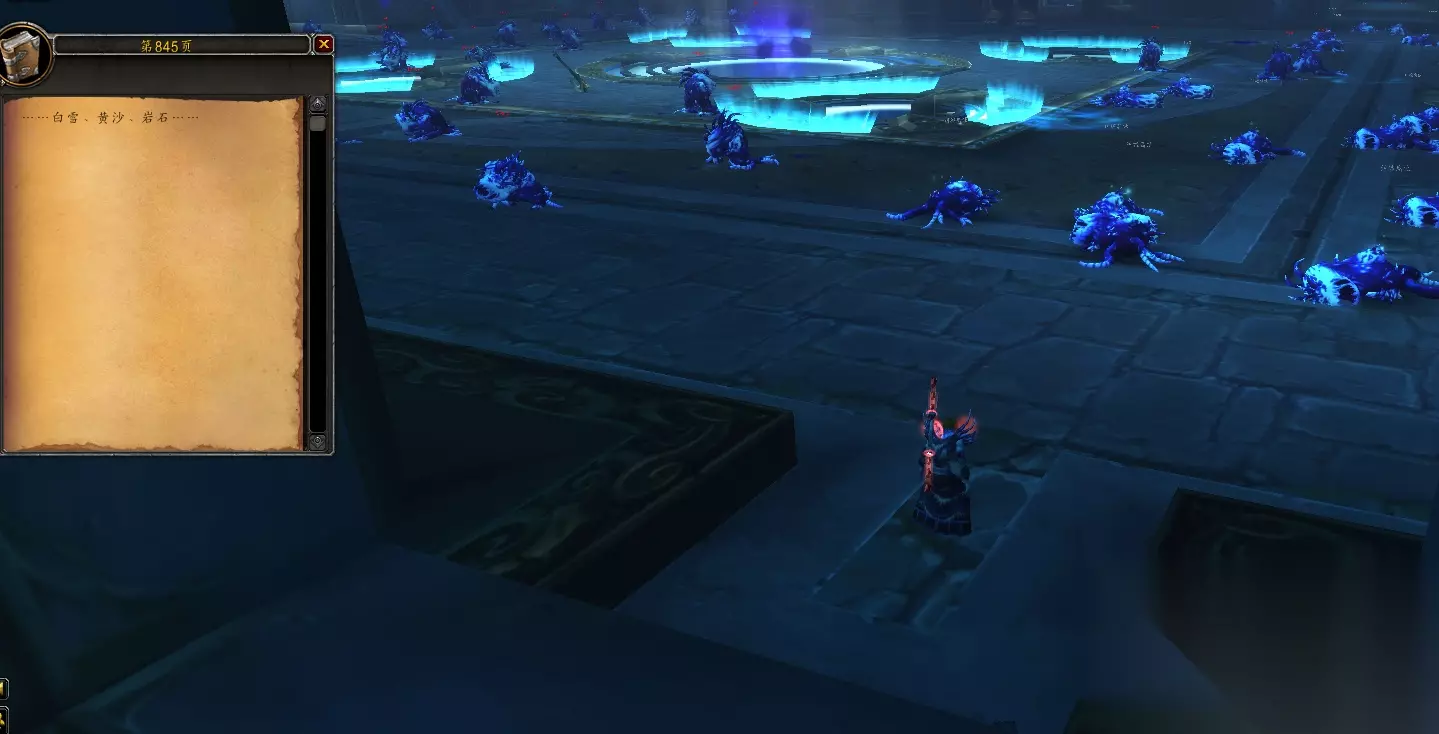 然后来到决战奥格瑞玛团队副本中,进入与四号Boss傲之煞战斗的房间,在下图位置就能找到第854页“……白雪、黄沙、岩石……”。(如下图)
