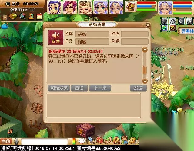 满人后点下开启副本,等系统来提示 当你看到下图提示,就可以通过金毛猿进入副本了,位置在AL靠近花果山的地方