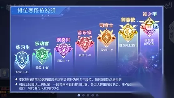 目前QQ炫舞排位赛段位分为练习生、乐动者、演奏师、音乐家、司音士、御音使、神之手七个大段位,每个大段位下分为别有若干个小段位。玩家通过排位赛可以获得胜点,胜点可以用来提升自己的段位,司音士以上段位玩家,一段时间不进行排位比赛,会进入休眠降段阶段,胜点会不断下降,再次进行一场排位比赛可以终止休眠降段状态。