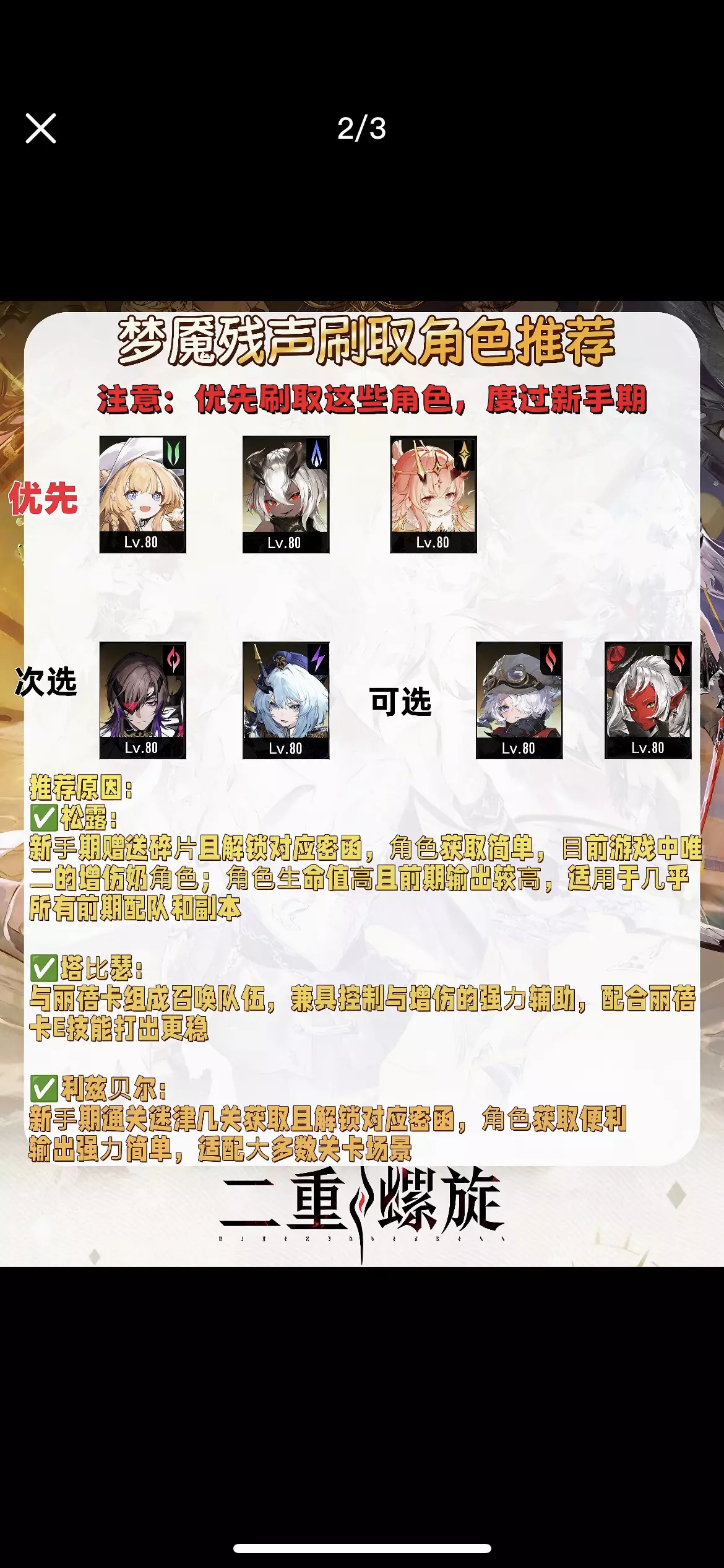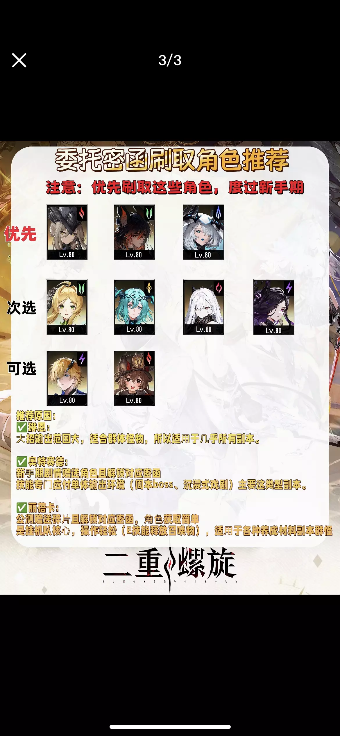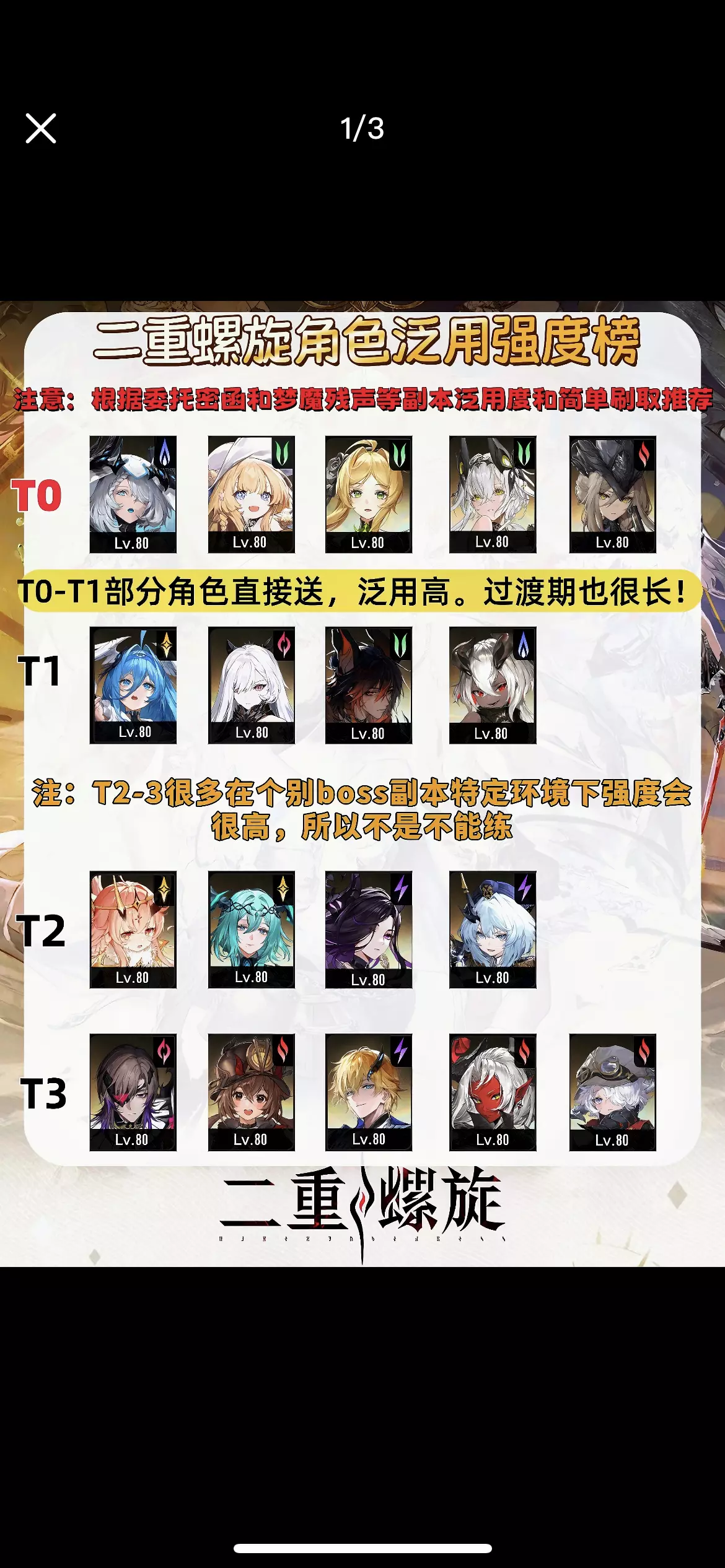 注意:根据委托密函等副本泛用度和简单刷取推存 ✅️T0-T1部分角色直接送,泛用高。过渡期也很长! 🚨注:T2-3很多在个别b0SS副本特定环境下强度会很高,所以不是不能练 #二重螺旋 #二重螺旋攻略 #二重螺旋角色强度榜 #二重螺旋赛琪 #二重螺旋全球公测 #二重螺旋公测征集