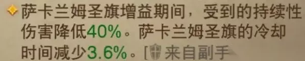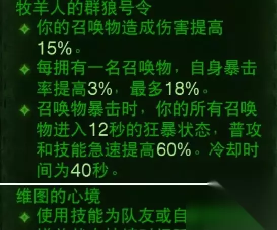 圣旗鼓舞士气,让你和你周围的召唤物急速提高20%、暴击提高20%,持续6秒,旗子也是这套BD的核心BUFF,关键是可以给召唤物整体提高输出。其次两个副手精华是没有太多提升,只能给到圣旗增加移速和减伤,移速对于PVE还有点用,减少没啥显著收益。