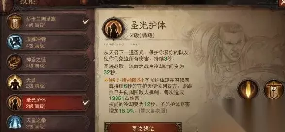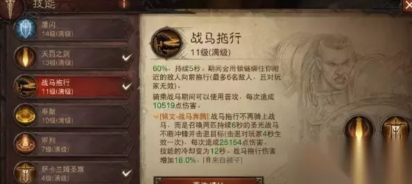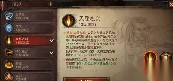 整套玩法就围绕一个召唤和天罚剑印的搭配,召唤出守卫天使+圣光战马,搭配阴影回响的分身都可以吃天罚剑印,最后冲锋战旗给所有单位急速和暴击,而且带维图和增益时间下旗子可以做到全程覆盖。缺点是召唤物的持续时间只有6秒,还是很短的,只能一波一波爆发来打,毕竟是娱乐玩法大家也不要太纠结。如果你对召唤流感兴趣,想要玩好这套必须多推冷却时间,如果搭配觉醒还是可以做到不间断召唤的。 二、技能详情