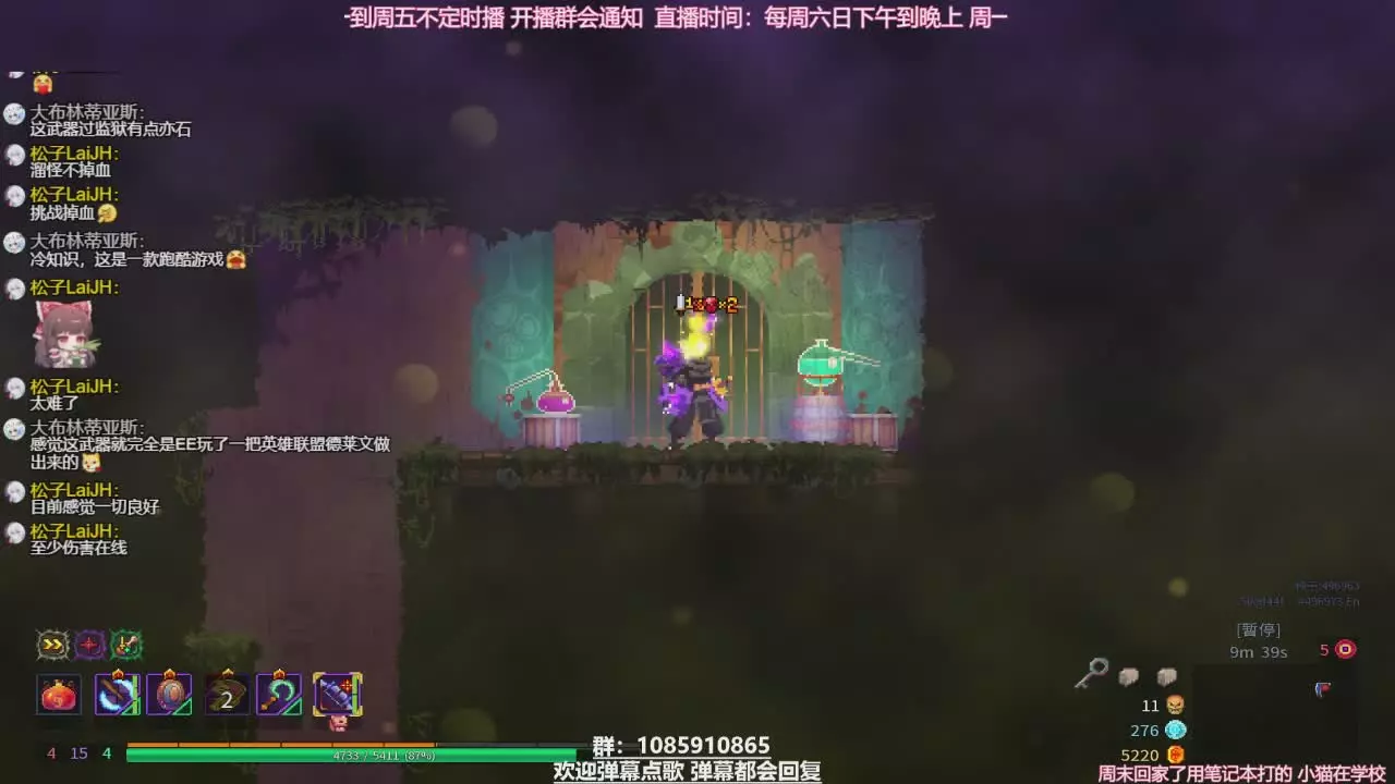 这是《重生细胞》的点播直播内容,主播进行单投斧玩法挑战,全程保持二伤,直播中观众互动热烈,还可进行点歌、点播其他玩法,展示了游戏内战斗、地图加载等场景。