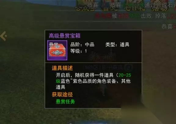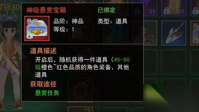 至尊悬赏宝箱 神级悬赏是最高级别的悬赏任务,要求玩家击杀比自己等级高很多的小怪,任务难度非常之高,但同时奖励也异常丰厚。神级悬赏任务完成之后会奖励一个神级悬赏宝箱,开启之后可以随机获得一件橙色或者红色品质的装备或者其他道具。