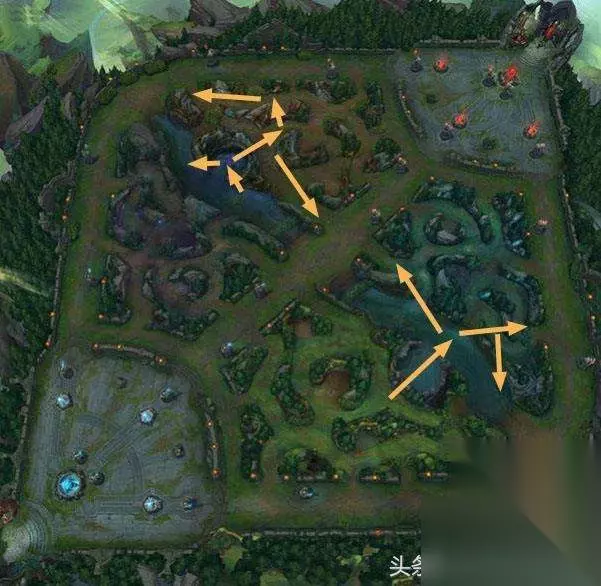 首先来说说豹女这个英雄怎么绕视野的问题。图中有从上半野区和下半野区gank或者说入侵的两种路线,每种都可以非常出其不意的出现在敌人身后。豹形态的W技能cd非常短,而且能够翻墙,我们利用好这一点可以轻松的做到绕视野的效果。