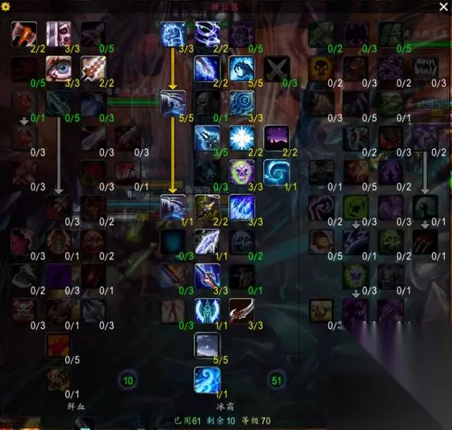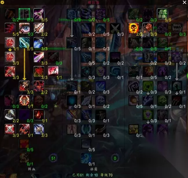 魔兽世界怀旧服巫妖王之怒前夕版本已经开放一段时间了,相信很多玩家都已经体验了心仪已久的新职业死亡骑士了吧,很多玩家也都在研究死亡骑士的技能和天赋,本期,小编就为大家分享几个常用的死亡骑士天赋。 1.常用鲜血DKT 深血加法,这套天赋能抗能打能恢复,练级或者下副本都可以,点了凋零天赋让DK的群拉能力更强,DK作为一个坦克,心脏打击必点,不懂的可以多看看技能介绍,在前夕版本中,莫格莱尼可以不用点出来,等到80级再点出来。