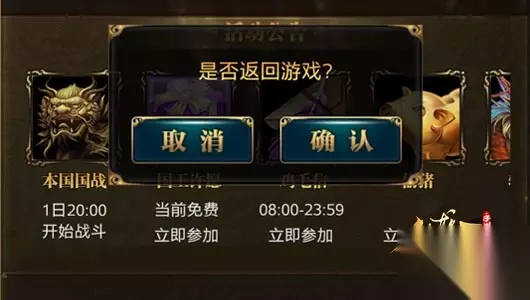 继续战斗,退出休息 退出休息模式并返回游戏,除了点击“返回游戏”外,还能利用活动来退出游戏。点击活动公告中的任意活动,提示是否返回游戏,点击确认即可回到游戏,人物被传送到本国卧龙城安全区。不过需要注意的是,手机直接回到桌面,游戏是不会结束的,而关闭进程或者清楚应用都是会关闭游戏的。
