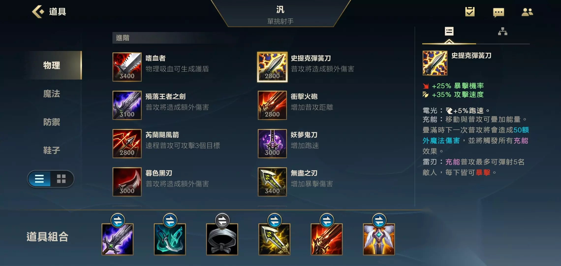第二件装备我们就做电刀就好了,提高VN的攻速和暴击率,第三件装备我们就做绿叉也同样是为了提高自己的攻击速度和暴击率。