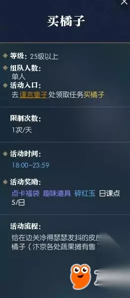 买橘子 等级要求:25级以上 组队人数:单人 活动入口:在汴京的谨言童子处领取任务 限制次数:1天1次 活动时间:18:00-23:59 活动奖励:点卡福袋、碎红玉、日课点5