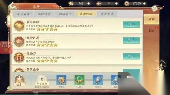 2、每日必做任务。 这种方法是玩法多样,而且不仅有装备铜币,还有大量的经验和经验丹。去点击每日经验那里,会有相应的经验获得推荐给你。